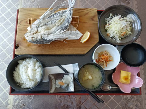飛魚の味はうす塩で一夜干しで旨味をを増した飛魚を開きにして唐揚げしたもの。